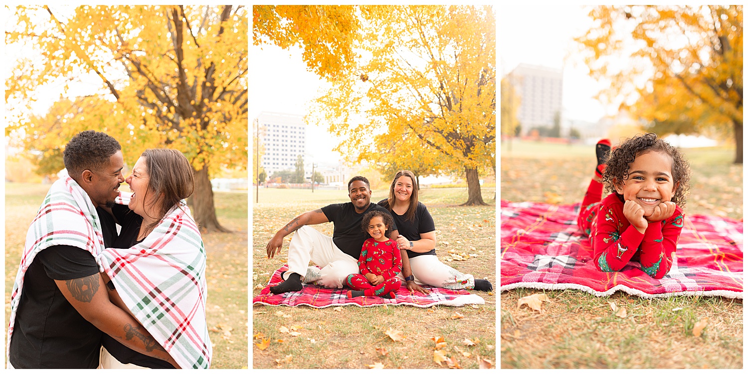 We met up with the Robinson family in downtown Indianapolis at White River State Park for their Christmas jammie photos, and it was just the sweetest time. The trees still held onto a touch of warm fall color, giving us that perfect blend of autumn coziness and holiday cheer. Their blanket was soft and snuggly, the air was crisp, and their little girl was absolutely full of giggles–the kind that make you smile without even realizing it.